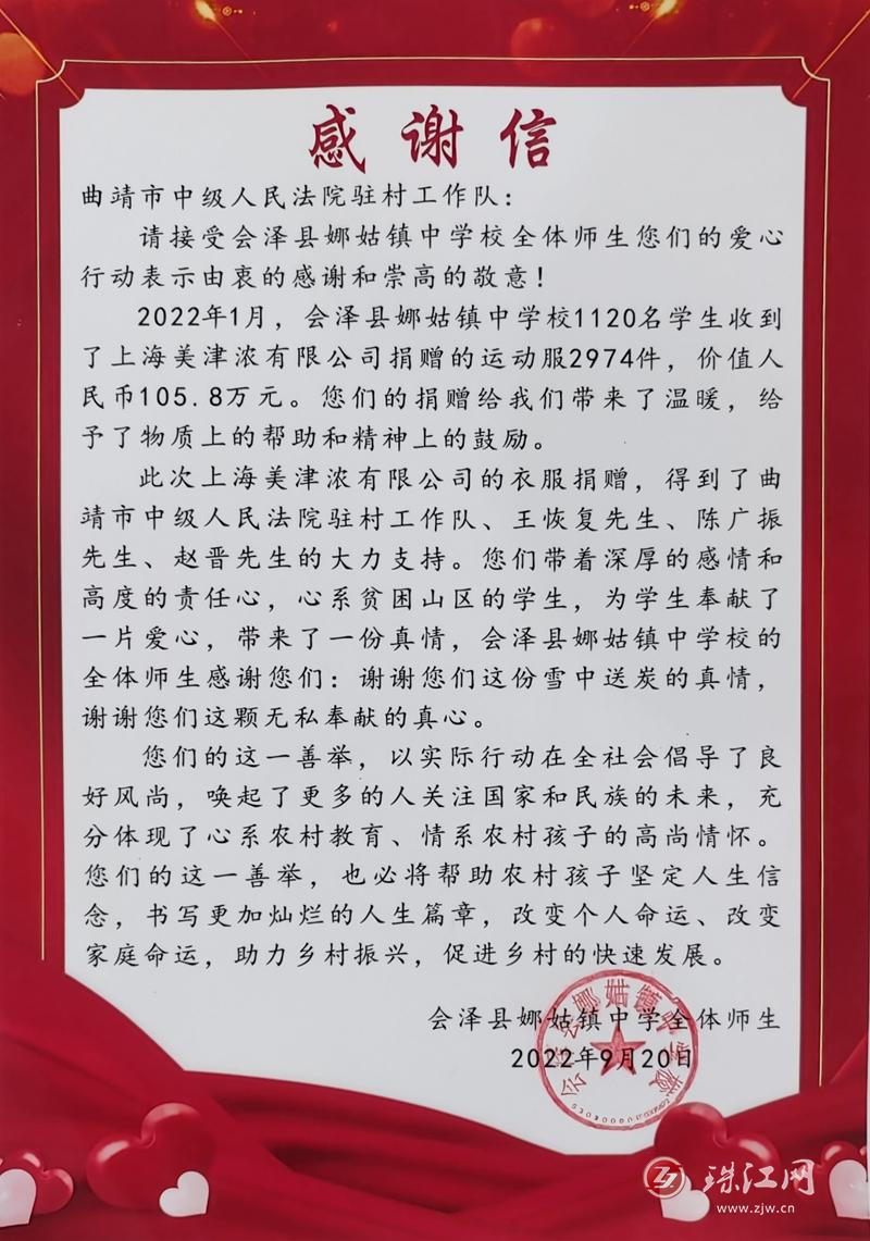 2021年下半年,曲靖市中级人民法院驻村工作队队员完成轮换后,通过与娜姑中学、石门坎小学进一步沟通,了解到学校里还有很多家境困难却成绩非常优异的学生。曲靖市中级人民法院驻石门坎村工作队人员经多方联系,与爱心企业上海美津浓有限公司及爱心人士陈广振、王恢复、赵晋等沟通联系捐赠具体细节,与娜姑镇分管领导及娜姑中学领导联系接受捐赠事宜,顺利完成78箱、2974件运动衣裤(价值人民币105.8万元)的捐赠活动。