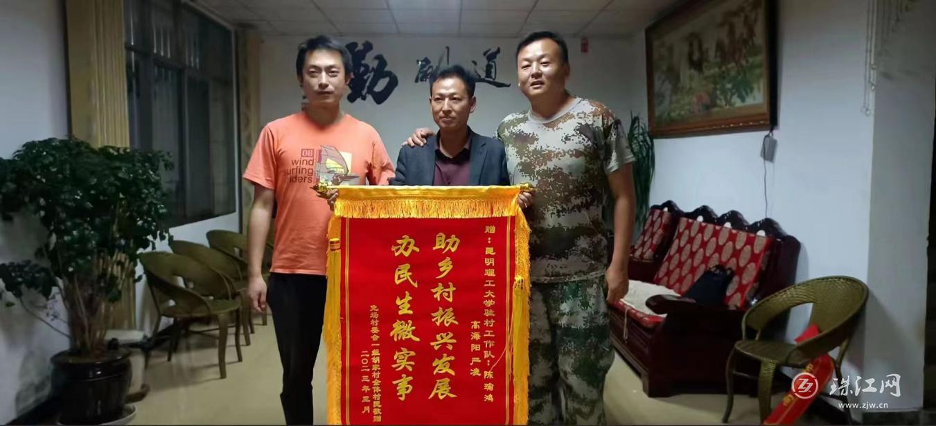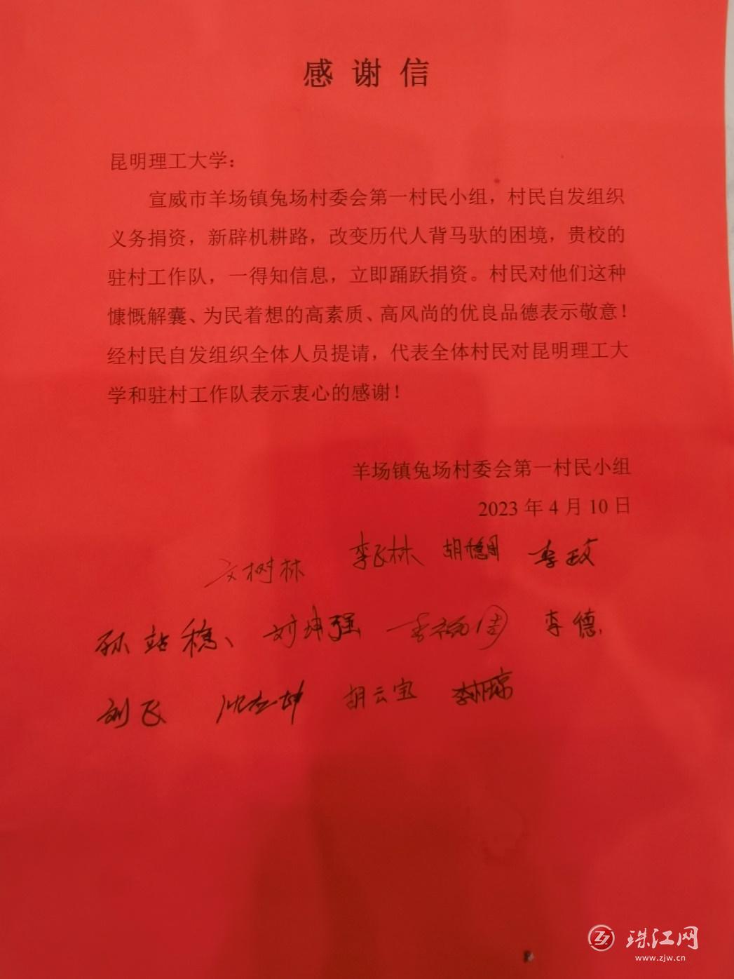 2023年4月11日,宣威市羊场镇兔场村委会一组胡家村村民自发组织向昆明理工大学和驻兔场村工作队送来了绣有“助乡村振兴发展办民生微实事”的大红色锦旗和一封村民们联名的感谢信,以此表达对昆明理工大学和驻兔场村工作队的感激之情。