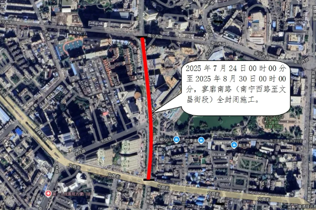 7月24日至8月30日,寥廓南路(南宁西路至文昌街)实施封闭施工,请注意绕行!